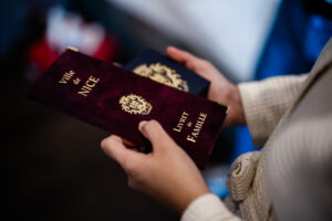 Celebrating with an outdoor ceremony, Emmanuel and Adhisti chose to say their vows outside in the open air, with an incredible view of the golden sun over the glistening water of the Côte d’Azur. Taking place a little later than normal in the late afternoon, we were lucky enough to have the most perfect weather for the ceremony, drenching everyone in a gorgeous golden hue as the sun set behind us. As a chateau de Crémat wedding photographer, it’s always lovely to see outdoor civil ceremonies, where the bride and groom and their guests can truly make the most of the gorgeous surroundings. After some readings, a sand ceremony and the exchanging of rings, Emmanuel surprised Adhisti with a signing rendition of ‘all you need is love’, which was very reminiscent of the movie Love Actually. With everyone swaying in time to the song in the warm golden light, this was a pretty special moment indeed.