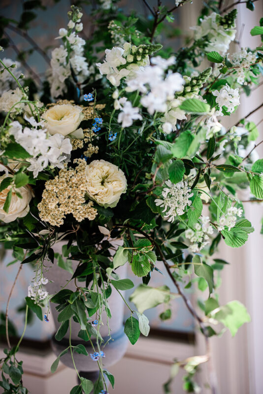 Following the ceremony, guests moved freely between the house and rose terrace, sharing stories and toasts. Framed by spring blooms and greenery, the rose terrace is always a beautiful location for Pynes House wedding reception drinks and canapés.